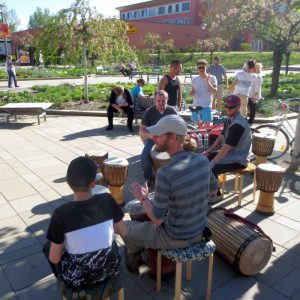 Die Innengestaltung des ‘Muckenbus’ wurde ebenso flexibel gestaltet wie die Außengestaltung. Hierbei ging es vor allem um eine ideenreiche, leicht auf und abbaubare Bühnengestaltung für den Innenraum des ‘Muckenbus’. Den TeilnehmerInnen standen dafür verschiedene Dekoelemente wie bunte Stoffe und Bänder, Lichterketten, Reifenmöbel sowie die Motiventwürfe auf den unterschiedlichen Untergründen aus den Stencil Workshos zur Verfügung. Im Workshop-Bereich Musik entwickelten die TeilnehmerInnen musikalische Beiträge für ihre ‘Muckenbus’-Show, die zum Projektabschluss in Form einer öffentlichen Veranstaltung mit dem ‘Muckenbus’ präsentiert werden sollte. Im Mittelpunkt der Musik-Workshops stand die eigene Kreativität und die Zusammenarbeit in der Gruppe. Neben dem Üben und Proben von individuellen Musikbeiträgen, erarbeiteten die TeilnehmerInnen unter professioneller Anleitung auch eine gemeinsame Djembe-Trommelperformance für die ‘Muckenbus’-Show. In den Trommelworkshops lernten die TeilnehmerInnen traditionelle afrikanische Rhythmen im Ensemble kennen. Es wurden ihnen die spezifischen Spieltechniken der afrikanischen Djembe, die Grundschläge an den Trommeln, vermittelt und einfache Begleitrhythmen gespielt.